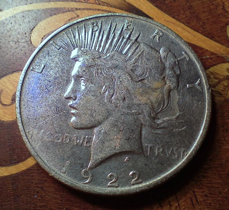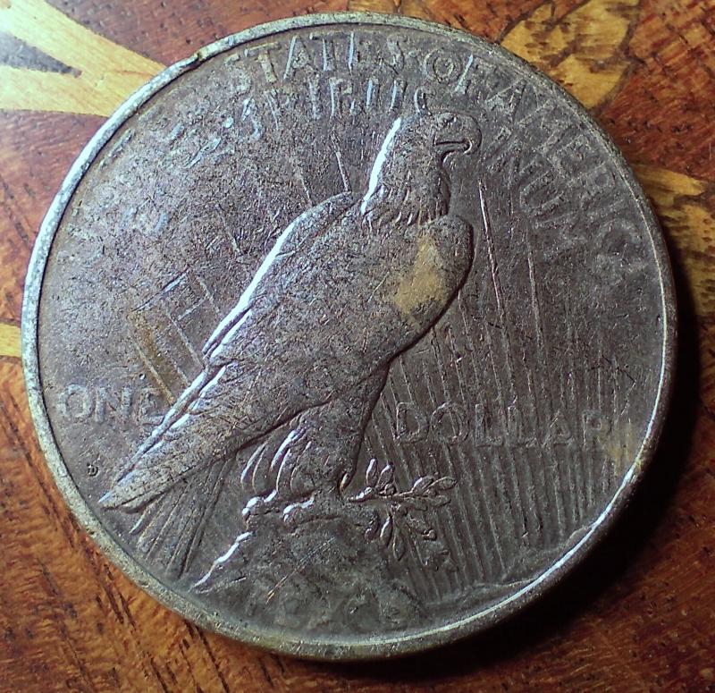 The Peace dollar was Minted from 1921 to 1928, and again in 1934 and 1935. It was designed by Anthony de Francisci. The obverse is, and the reverse is a bald eagle holding an olive branch with the legend "Peace". It was the last United States dollar coin to be struck for circulation in silver.